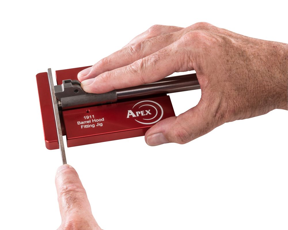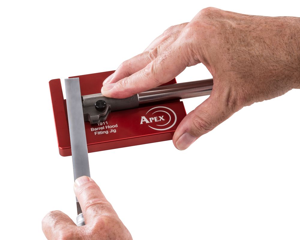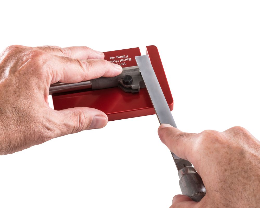 This is the 1911 Barrel Fitting Fixture designed by master gunsmith Randy Lee. It solves the problem of holding a 1911 barrel in the correct position while you file the barrel hood to length and width for slide fitment. Without this fixture, maintaining proper alignment and consistent pressure during hood filing is difficult, leading to uneven material removal or improper lockup. This fixture secures the barrel in the correct orientation, allowing precise, repeatable hood fitting work. Available in aluminum or 3D Polymer construction.