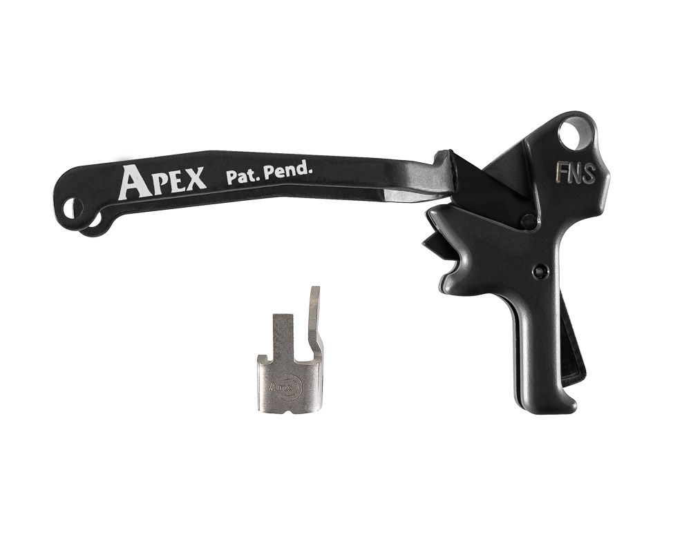 Drop-in trigger kit for the FNS series. Reduces pull weight to approximately 5.5 lbs, shortens pre-travel, over-travel, and reset distance, and delivers a crisp break — all while maintaining factory safety values via a center-mounted pivoting safety. No fitting required.