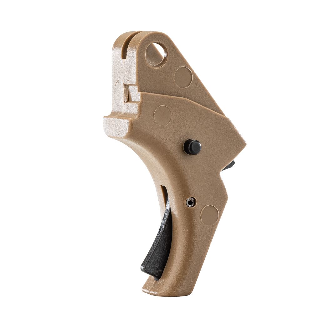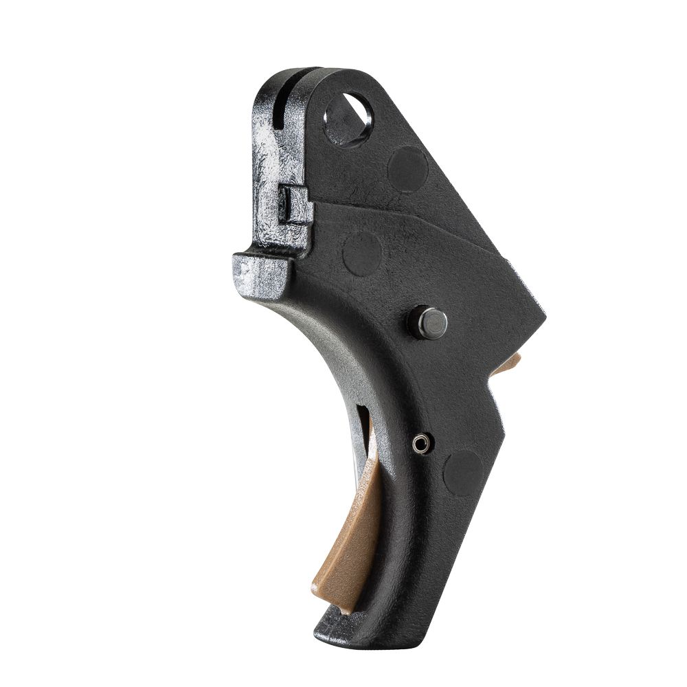 Direct replacement trigger for Smith & Wesson SD, SDVE, and Sigma-series pistols. Eliminates the factory hinged trigger design, replacing it with a solid aluminum shoe that uses a center-mounted pivoting safety blade. Compatible with both standard and hinged-trigger frames. Can be installed standalone or combined with a spring kit for further weight reduction.
