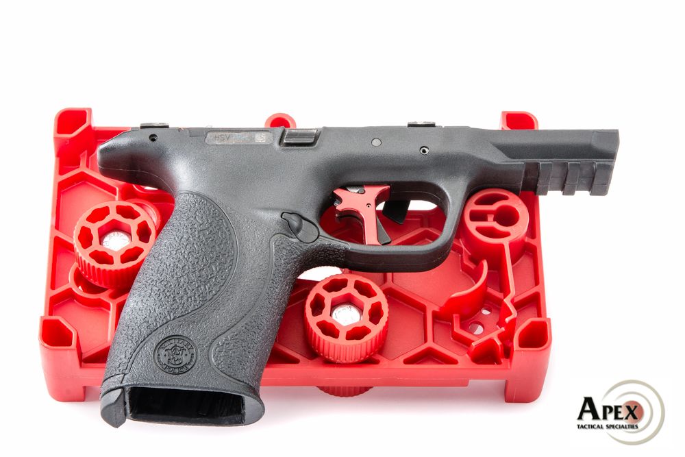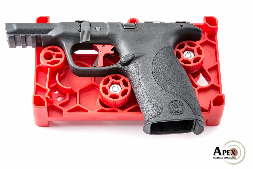 - Pre-positioned frame bosses adjust to hold the pistol securely for pin removal