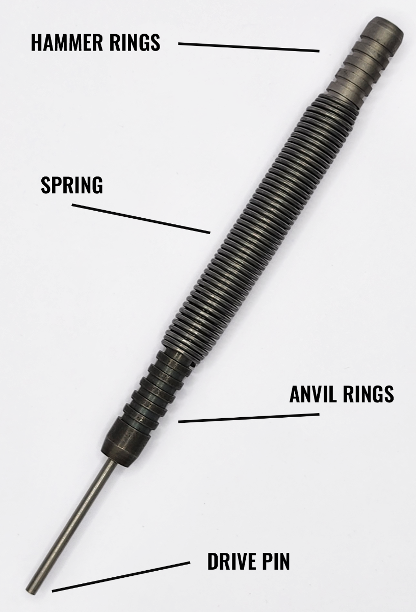Standard punches require a hammer and rely on user alignment. This punch is spring-loaded, so the energy is stored and released on impact rather than transferred through a hammer strike. The flat tip also reduces the chance of the pin walking or the punch slipping off the pin face.