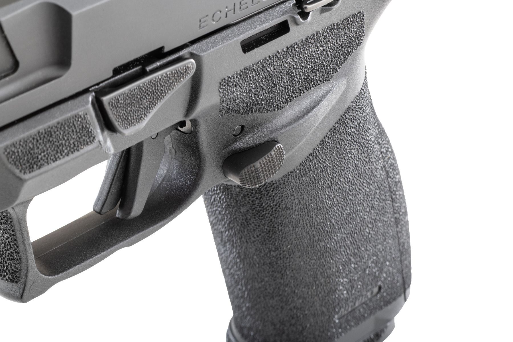 Single-sided extended magazine release for Springfield Echelon and Echelon Compact frames. Replaces the factory ambi release to reduce accidental magazine drops from holster pressure. The extended pad sits .060″ above the grip shield at its highest point, shortening the reach for faster reloads without increasing holster snag risk.