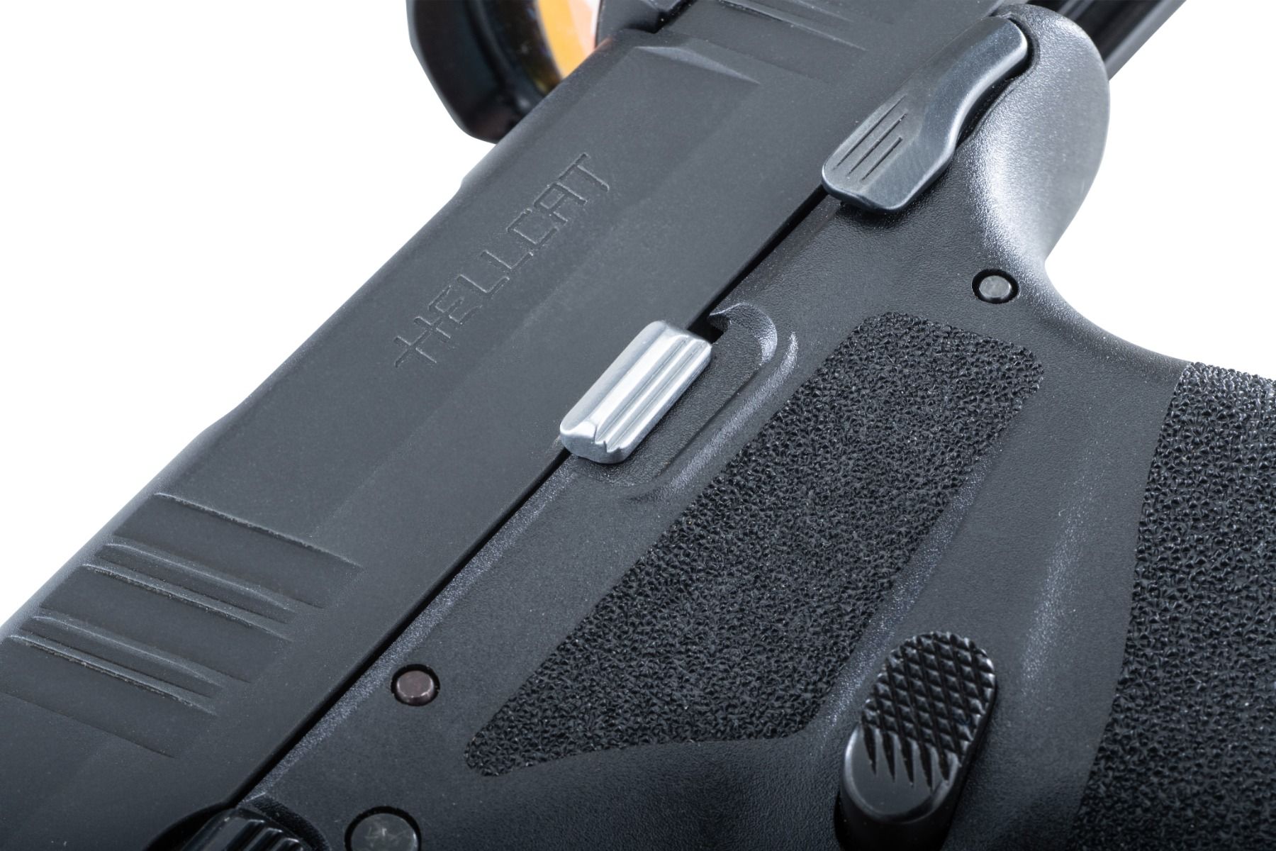 This extended slide lock lever is a direct replacement for the factory Hellcat slide lock lever. It solves the problem of limited purchase area when locking the slide open, particularly during field stripping or malfunction clearing drills. The extended, serrated face provides a more positive contact point for your thumb without changing the internal geometry of the frame.