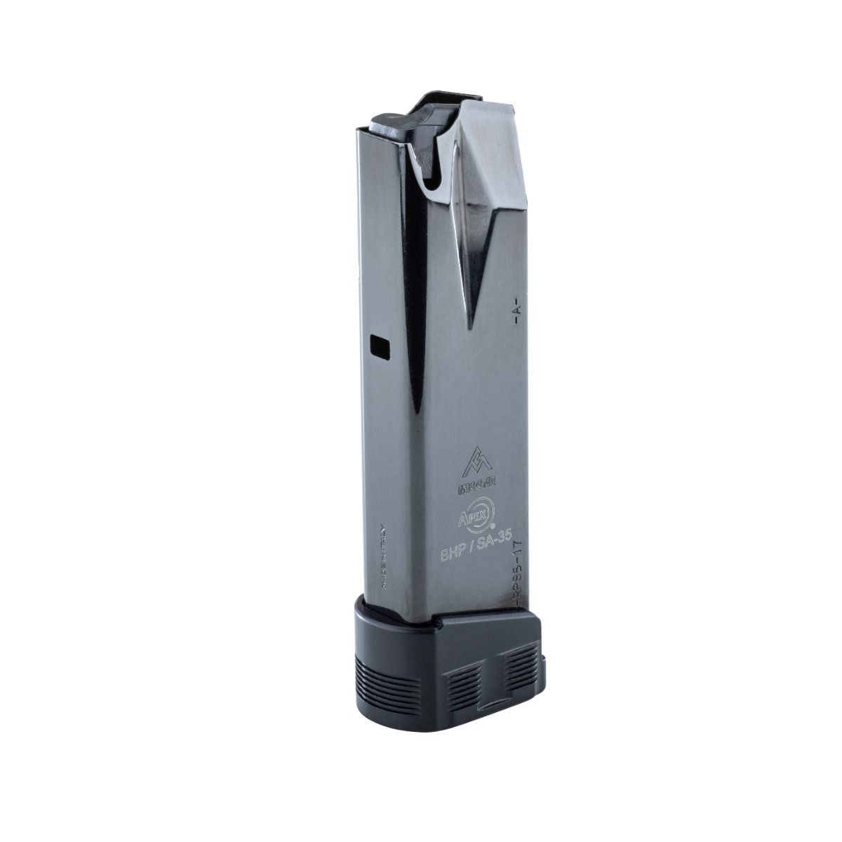 This is a 17- or 19-round replacement magazine for the Springfield Armory SA-35 9mm pistol, specifically designed for use with an Apex Magazine Well. It solves the capacity limitation of the factory 15-round magazine while providing a blended base pad that integrates with the frame contour for positive emergency extraction. The magazine body is a Mec-Gar unit modified by Apex to ensure reliable feeding with quality domestic ammunition.